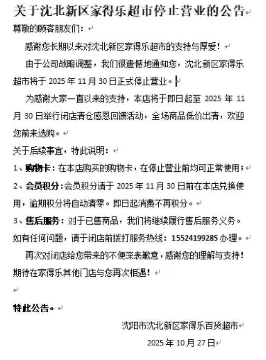 通知布告显示,该超市将于2025年11月30日正式遏制停业。持有购物卡或会员积分的顾客应尽快去消费或完成兑换。