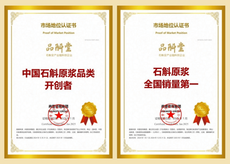 近期,品斛堂凭仗其正在石斛全财产链的杰出表示,被国际权势巨子征询机构灼识征询(CIC)认证为“中国紫皮石斛全财产链第一品牌”“全国最大的紫皮石斛全财产链办事商”、“中国石斛原浆消费者对劲度第一”。